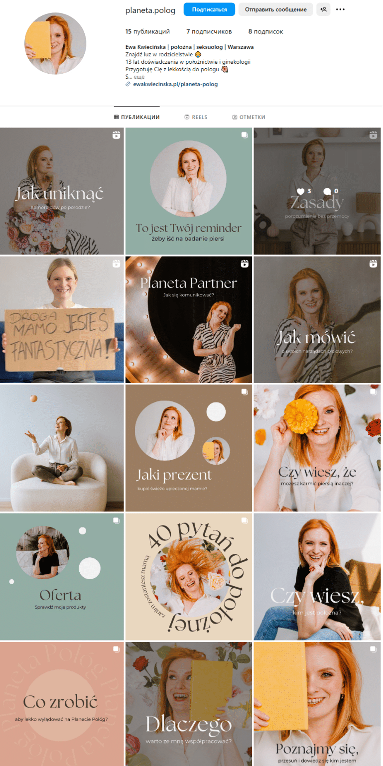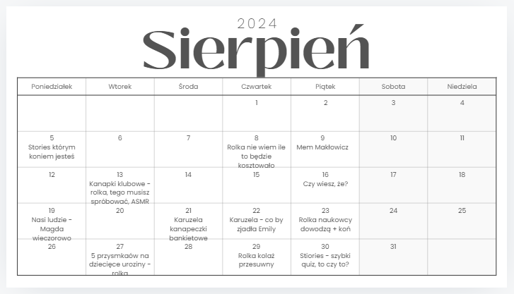 Gotowy content plan wysyłam do klienta do 25 każdego miesiąca w formie prezentacji. Tematy publikacji rozpisuję na kalendarzu, a każdy post/rolka jest opisany wraz z copy i hashtagami na slajdzie.