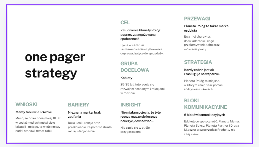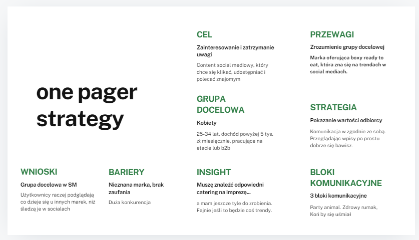 Poniżej możesz zobaczyć przykłady strategii przygotowanych dla moich klientów. Jest to podsumowanie w formie one pager'a, czyli wszystkich analizowanych wcześniej aspektów.